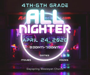 4-5th graders can be dropped off at the church at 9pm for a night designed just for them with games, pizza, movies…and even a little sleep. Parents can pick them up at 7am. Cost is $5/child. Click below to register.